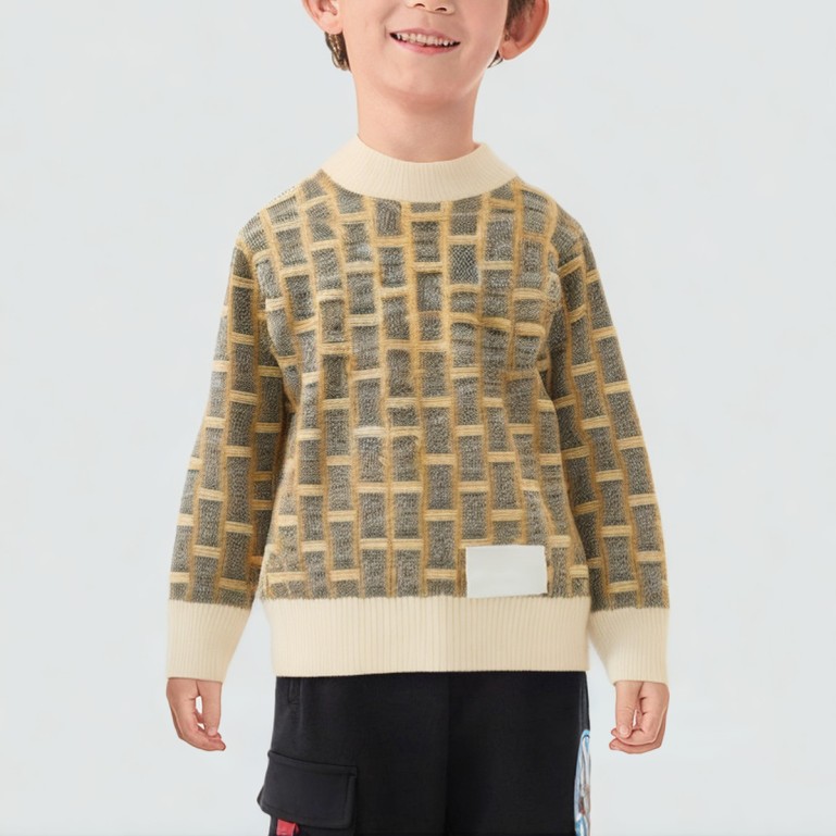 This sweater is crafted from high-quality cotton, offering softness, comfort, and breathability against the skin—perfect for children's everyday wear. Featuring a checkered pattern as its main design element, it incorporates thoughtfully selected color-blocked accents for a simple yet lively look that captures the essence of autumn. The crew-neck pullover style ensures easy on-and-off wear, while its standard thickness provides just the right warmth for fall. Made from eco-friendly materials that are safe and healthy, it gently hugs children's skin for worry-free daily comfort.