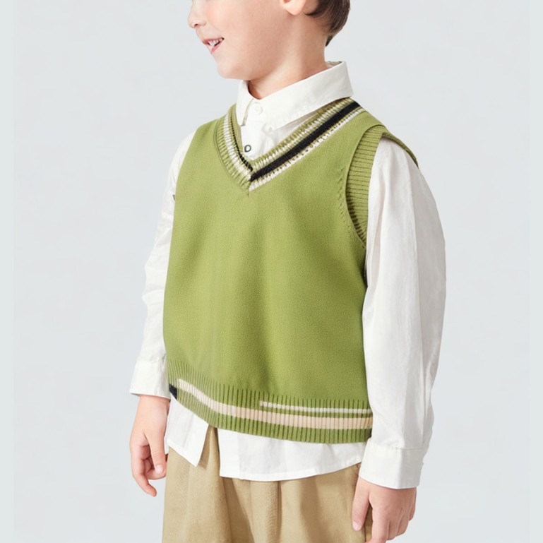This sweater features a polyester-cotton blend fabric that is soft to the touch and offers excellent breathability. Its thickened design provides extra warmth for autumn and winter. The simple yet elegant V-neck design pairs effortlessly with shirts or T-shirts to create stylish looks for children. The sleeveless design allows for easy movement, making it perfect for everyday wear, school life, or casual occasions. The overall clean and crisp style combines comfort with practicality.