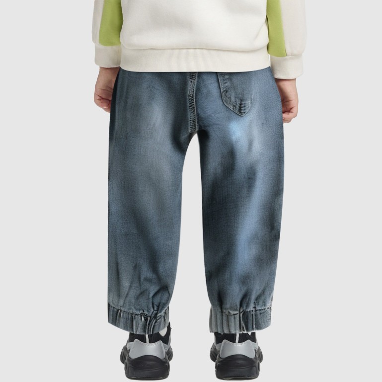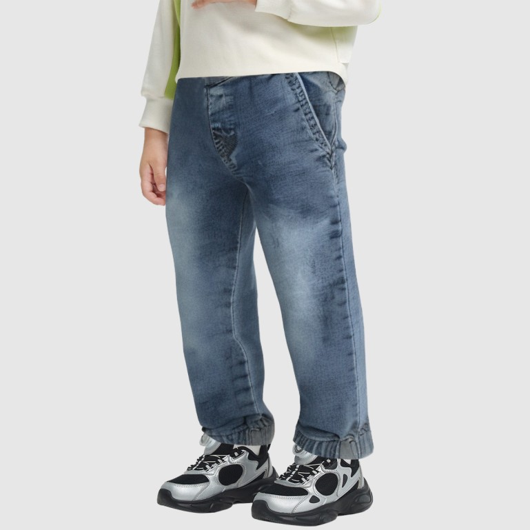 These pants feature a blend of 95% cotton and 5% spandex, offering soft comfort and stretch that hugs children's legs, perfect for toddlers and daily activities. The light wash blue design is fresh and natural, enhanced with embroidered details for a stylish touch. The slim-fit tapered leg silhouette combines with side pockets for both aesthetics and practicality in storing small items. The elastic waistband ensures easy on-and-off wear, ideal for active children.