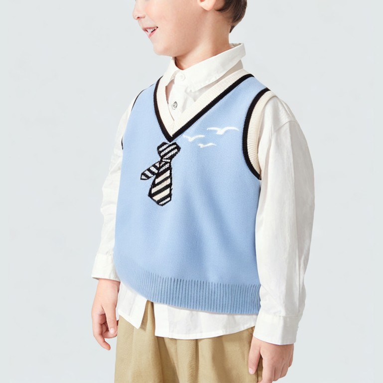 This sweater features a polyester-cotton blend fabric that is thick and warm, with a soft and comfortable feel while remaining breathable. The vest design is simple and elegant, with a V-neck for easy on-and-off wear. Adorned with a cute tie pattern, it adds a touch of fun and style, making it suitable for daily wear or formal occasions for infants, toddlers, and preschoolers. The sleeveless design ensures unrestricted arm movement while allowing easy layering under shirts or long-sleeved tops.