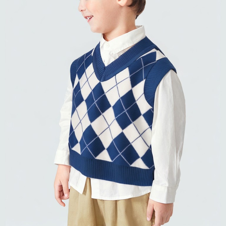 This sweater features a premium polyester-cotton blend fabric that feels soft to the touch, offering warmth and comfort. Its thick, heavyweight design makes it perfect for autumn and winter wear. The sleeveless style allows babies to move freely, and it can be worn alone or layered over shirts and T-shirts for versatile styling. The simple yet elegant V-neck design is enhanced with diamond jacquard and floral patterns, blending fashion-forward appeal with playful charm. Perfect for daily outings, family gatherings, or outdoor activities.