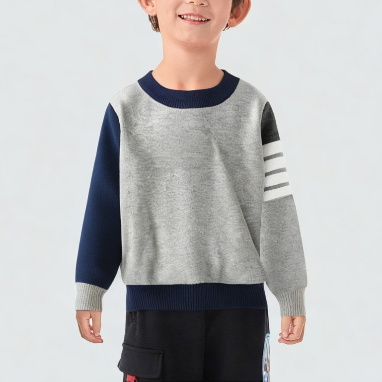 This sweater features a high-quality polyester-cotton blend fabric that is soft, comfortable, and provides excellent warmth, making it ideal for autumn and winter wear. The pullover design is simple and elegant, with a sailor-style round neckline that makes it easy for children to put on and take off. The striped color-blocked detailing on the shoulders adds a stylish touch, giving the garment a fashionable and vibrant look. The thick knit material not only enhances the wearing experience but also ensures durability, making it suitable for everyday casual wear and outdoor activities.