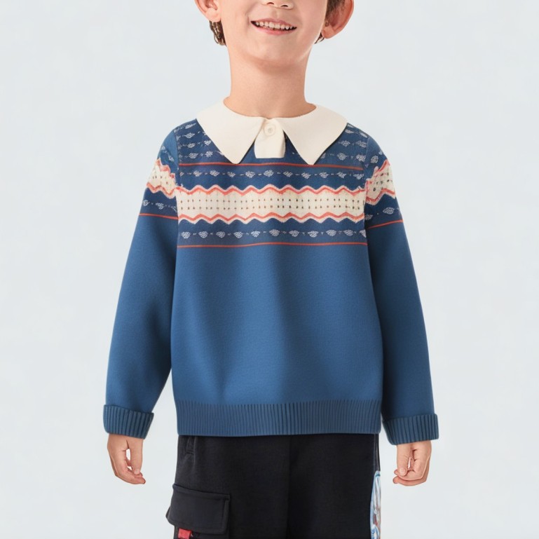 This sweater features a premium polyester-cotton blend fabric that feels soft and stretchy, with a thick design ensuring warmth for autumn. The body showcases a wave-patterned check design, presenting a Korean-inspired fashion style. The stand-up collar with a single button accent adds a touch of sophistication and dimension. The pullover style is simple and practical, making it easy for children to put on and take off while maintaining a comfortable, snug fit around the neck. It's an ideal choice for everyday wear and outdoor activities.