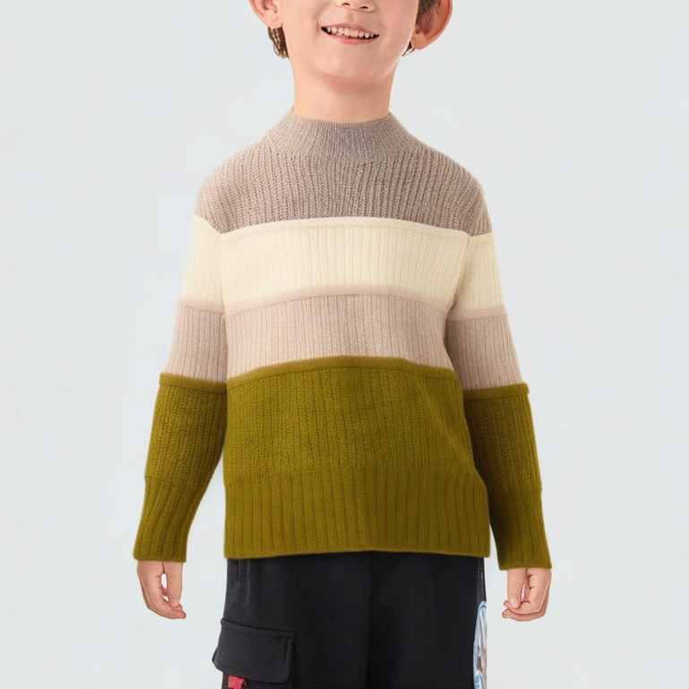 This sweater is meticulously crafted from premium cotton fabric, offering a soft, skin-friendly feel and excellent breathability for everyday wear. Its design features a minimalist four-color layered stripe pattern, combining vibrant hues with a touch of sophistication to add a fashionable edge for young boys. The pullover style with a crew neck ensures easy on-and-off wear while maintaining neck comfort. Its standard thickness provides warmth for autumn and winter while allowing freedom of movement during daily activities. The overall minimalist design pairs effortlessly with various bottoms. Made from eco-friendly materials, it ensures safety and health, offering parents greater peace of mind.