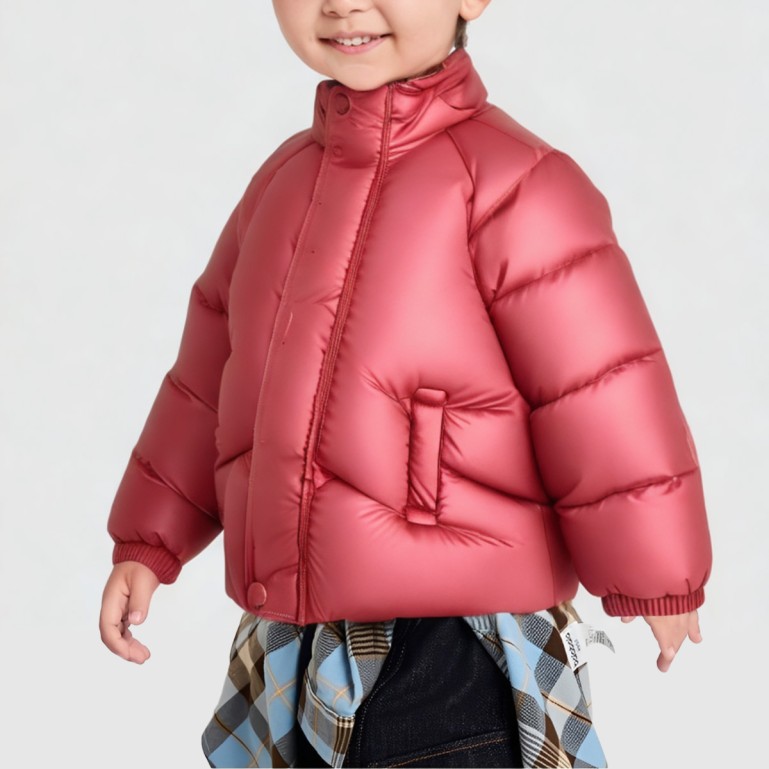 This jacket features a 100% polyester worsted fabric with matching polyester down filling, offering warmth and lightness ideal for winter outdoor activities. The stand-up collar with hood effectively blocks wind and cold, while the zippered placket ensures easy on/off. Regular sleeves and length provide unrestricted movement, and printed lettering adds playful interest, blending casual style with practical functionality.