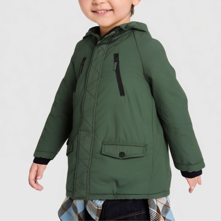 This jacket is crafted from polyester fabric, offering a lightweight feel with excellent durability, making it ideal for everyday wear in spring, autumn, and early winter. The full polyester filling provides moderate warmth, while the zippered placket design ensures easy on-and-off wear. Its solid-color design and elongated silhouette provide enhanced coverage during active play. The breathable, windproof, and insulating fabric suits diverse settings like school, outdoor recreation, and daily commutes. The garment-dyed process ensures color stability and natural tones, making it effortless to coordinate with everyday outfits.