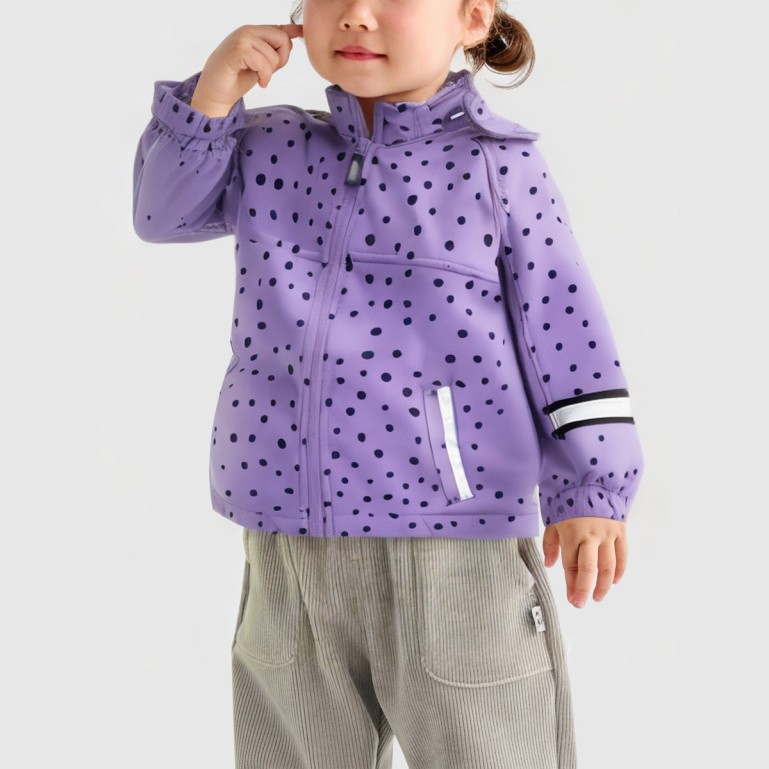 This jacket features a polyester fabric and full polyester filling construction, offering waterproof, windproof, and breathable properties, making it ideal for everyday wear in spring and autumn. The softshell outer layer provides reliable rain protection, while the soft fleece lining offers comfortable warmth for children during temperature changes. The regular sleeve design and hooded style enhance practicality, and the smooth zipper makes it easy to put on and take off. The overall design is lightweight and non-bulky, allowing children to move freely.